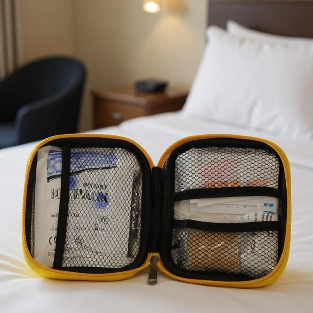 Travel first aid kit with plasters, wipes & bandages. Organized and ready for quick treatment of minor injuries. Perfect for safe and worry-free travel adventures. Show more