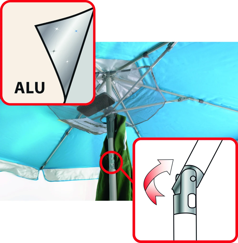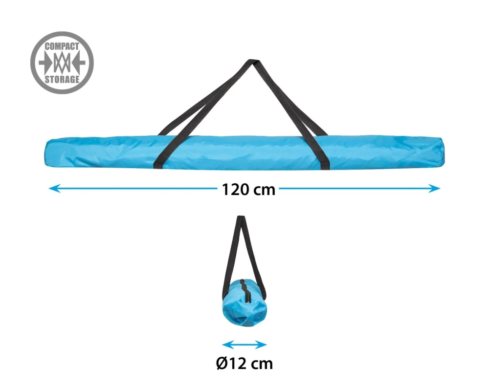 Modern beach and sun umbrella designed to make every outing to the beach or outdoors comfortable. Compact and lightweight aluminium pole for easy transport. The high-durability, UV-stable canopy provides reliable sun protection. Loops at the ends of the ribs allow secure anchoring in strong wind, while two hooks and a practical net underneath provide space for personal items. Adjustable side tilt ensures optimal shade at any time of day. Includes a handy carry bag – ready for every adventure.