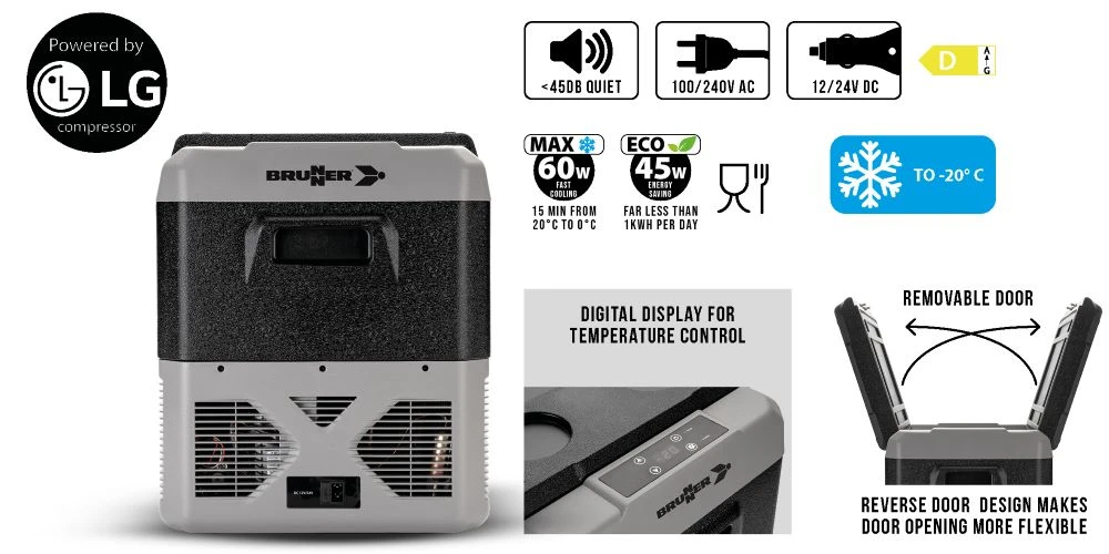 Glacière de Brunner avec affichage numérique de la température et porte réversible. Elle offre une puissance de refroidissement maximale allant jusqu'à -20 °C, est économe en énergie avec 45 W et convient à une utilisation dans la voiture ou à la maison. Idéale pour le camping ou les sorties. Afficher plus